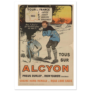 This vintage French poster celebrates the dominance of Alcyon bicycles in the 1910 Tour de France. A leaderboard prominently lists Alcyon riders Lapize, Faber, Garrigou, and Vanhouwaert as the top four finishers of the race. The illustration features a jovial cyclist in a blue Alcyon jersey standing beside his bike, which is humorously "locked" to a tree with an oversized padlock. The text highlights technical components like Dunlop tires, Bowden brakes, and Eadie free wheels. This playful design effectively links professional racing victory with the reliability of Alcyon’s commercial products.