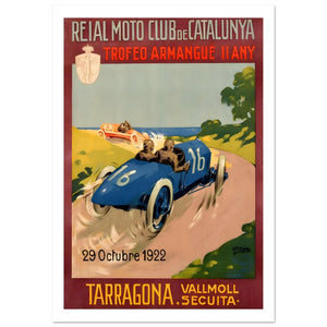 Vibrant vintage motor racing poster for the 1922 Trofeo Armangué near Tarragona, Spain. A blue number 16 car powers through a dusty coastal road ahead of an orange rival, capturing the speed, drama and early grandeur of Reial Moto Club de Catalunya competition motor-sport heritage.