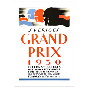 This sleek and minimalist 1930 poster promotes the Sweden Grand Prix, held on August 31st in Saxtorp, Skåne. The design features stylized profiles of three motorcyclists, each with distinctive helmet colors—blue, red, and black—conveying motion and excitement. The bold typography, with "GRAND PRIX" prominently displayed in orange, grabs attention while the smaller text at the bottom provides event details. The clean lines, vibrant colors, and dynamic silhouettes evoke the thrill of motorcycle racing, making this a classic example of vintage motorsport advertising. The poster captures the energy of the event and the speed of the race itself.