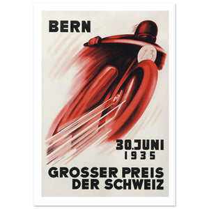 This minimalist and high-impact vintage poster advertises the "Grosser Preis der Schweiz" (Swiss Grand Prix) held in Bern on June 30, 1935. The artwork utilizes a bold, monochromatic red-and-black palette to convey a sense of extreme velocity. A stylized motorcyclist is depicted leaning aggressively into a turn, with dramatic motion streaks and blurred wheels emphasizing rapid movement. The clean, heavy sans-serif typography at the top and bottom provides a stark contrast against the white background, perfectly capturing the Art Deco influence and the industrial energy of mid-1930s European racing culture.