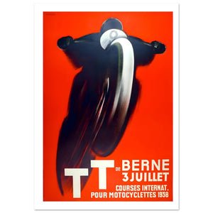 This striking 1938 Berne TT poster promotes the motorcycle race held on July 3rd in Switzerland. The design features a dynamic, abstract depiction of a motorcyclist in motion, leaning into a turn against a bold red background. The powerful motion is captured through sweeping lines, creating a sense of speed and excitement. The minimalist typography at the bottom boldly displays "TT de Berne" and the event details, with the emphasis on "Courses Internat. Pour Motocyclettes." The use of stark contrast and fluid lines makes this poster a visually captivating representation of motorcycle racing in its purest form, ideal for collectors.