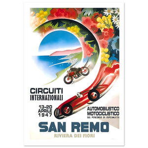 Radiant Italian racing poster for the 1947 San Remo Circuti Internazionali, blending motorsport and Riviera glamour. A scarlet race car and motorcycle sweep through a floral vortex framing the sparkling Ligurian coastline, celebrating sunlit speed, springtime colour and the romantic charm of Ospedaletti’s seaside circuit.