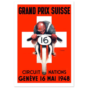 This vintage 1948 Grand Prix Suisse poster promotes the race held at the Circuit des Nations in Geneva on May 16th. The bold red and white design prominently features a motorcyclist, number "16," leaning into a curve, symbolizing speed and action. The backdrop features the Swiss flag, reinforcing the event's location and adding visual impact. The dynamic illustration captures the thrill of the race, while the simple yet striking typography highlights the event details. This poster is a perfect example of mid-20th-century motorsport advertising, showcasing both the excitement of the sport and the aesthetics of the time.