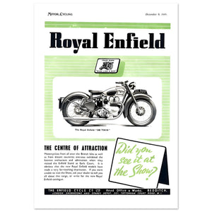 This vintage 1948 advertisement features the Royal Enfield "500 Twin" motorcycle, displayed prominently alongside the brand’s bold logo. The poster, styled with soft green and black tones, promotes the bike as "The Centre of Attraction," highlighting its appeal at the Earls Court Show. The advertisement encourages readers to ask their dealers for more details about the new Royal Enfield models. The bike’s classic design is showcased, with intricate details of the 500 Twin, and the slogan "Made Like A Gun" emphasizes its robust quality. The overall tone is nostalgic, representing the mid-20th century’s motorcycle culture and innovation.