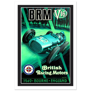 Striking vintage BRM V16 racing poster, featuring a green grand prix car hurtling along a tree-lined circuit, celebrating British Racing Motors’ 1949 engineering prowess from Bourne, England in emerald tones.