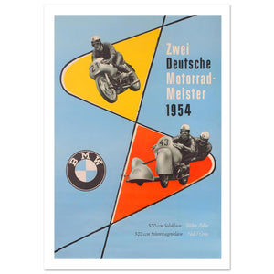 This dynamic 1954 poster celebrates the achievements of two German motorcycle champions, Walter Zeller and the team of Noll/Cron, who secured victories in both solo and sidecar classes. The poster features two powerful BMW motorcycles, one a solo bike and the other a sidecar combination, placed within bold geometric shapes of blue, yellow, and red. The vibrant design highlights the event, showcasing the 500cc solo and sidecar races. The text, "Zwei Deutsche Motorrad-Meister 1954," emphasizes the success of these racers, while the iconic BMW logo reinforces the brand’s dominance in the sport during the era.