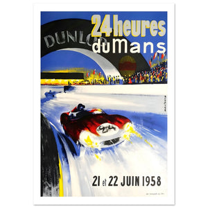 Atmospheric 1958 Le Mans poster showing a red sports car charging through a glowing wet track beneath the iconic Dunlop bridge. Bright headlights slice the darkness as grandstands and flags shimmer in the distance, capturing the drama, speed and endurance of the legendary 24-hour race.