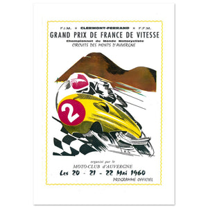 This vibrant poster promotes the 1960 French Motorcycle Grand Prix at the Circuit des Monts d'Auvergne. It features an action-packed illustration of a motorcyclist wearing a red helmet and a yellow racing bike with the number "2" on it. The rider leans into a tight curve, emphasizing speed and agility. The background depicts rolling hills, with the yellow border and checkered flag at the bottom heightening the sense of motion. The text highlights the event dates—May 20-22, 1960—organised by the Moto-Club d'Auvergne, and offers an exciting glimpse into this prestigious racing event.
