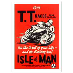 This bold 1961 Isle of Man TT poster highlights the excitement of the world-famous motorcycle races held on June 12th, 14th, and 16th. Featuring a dynamic illustration of a racer in full gear, number "1" on the bike, the poster captures the speed and thrill of the event. The red background enhances the intensity, while the text "For the thrill of your life – and the holiday too!" invites spectators to enjoy the races and the Isle of Man's beautiful landscapes. The clean typography and striking design make this a memorable piece for motorcycle racing enthusiasts and collectors.