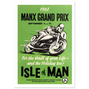 This vintage 1961 poster promotes the iconic Manx Grand Prix, held on September 5th and 7th, on the Isle of Man. The striking green background emphasizes the thrill of motorcycle racing, with a dynamic illustration of a rider zooming past in full gear, capturing the speed and excitement of the event. The bold text highlights the race details, while the slogan, "For the thrill of your life – and the holiday too!" invites viewers to experience the adrenaline rush of the Grand Prix alongside a memorable vacation. This retro design exudes the excitement and prestige of the race.