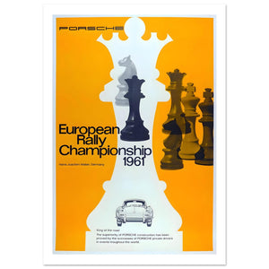 Bold Porsche poster celebrating the 1961 European Rally Championship, combining motorsport and chess strategy. A towering white king silhouette frames dark chess pieces and a classic Porsche 356 below, symbolising calculated precision, dominance and ‘king of the road’ status against a striking orange background field.