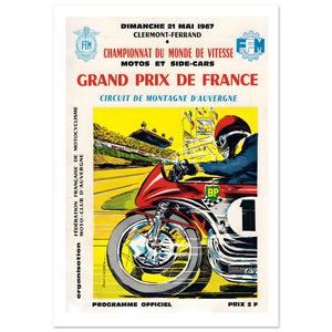 This vivid 1967 French Motorcycle Grand Prix poster showcases an action-packed scene from the Circuit de Montagne d'Auvergne. The artwork features a racer in a red helmet, skillfully navigating a curve on a sleek red motorcycle adorned with a BP logo. The vibrant yellow background emphasizes speed and motion, with the track and grandstands visible in the distance, capturing the excitement of the race. The bold "GRAND PRIX DE FRANCE" text highlights the prestigious event, while the details at the top, including the event date and organizer, add authenticity to this historic piece of racing art.