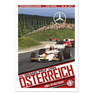 Evocative poster for the 15 August 1971 Grand Prix von Österreich at the Österreichring, Zeltweg, featuring a white and gold Yardley BRM leading scarlet rivals through a sweeping forested curve, beneath the giant hillside Mercedes star and packed grandstands alive with Austrian flags and colour.