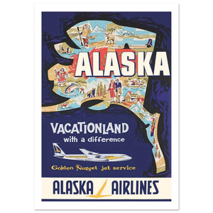 This vibrant vintage Alaska Airlines poster invites travelers to "Vacationland with a difference" through a rich, illustrative montage. Set within the dark blue silhouette of the state, a colorful map comes to life with iconic Northern imagery: an indigenous person in traditional attire, a leaping salmon, a brown bear, and a majestic reindeer. The design highlights diverse activities from dog sledding to modern jet travel. Below the central "ALASKA" lettering, a sleek "Golden Nugget jet" soars, emphasizing the airline's premium service. This artwork beautifully blends rugged wilderness heritage with the excitement of 1960s-era aviation.