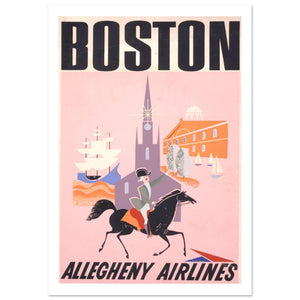 This whimsical vintage travel poster from Allegheny Airlines presents a stylized, pink-hued tribute to Boston’s revolutionary history. The central illustration features a cartoon-style Paul Revere mid-gallop on a black horse, pointing toward a simplified cityscape. Behind him, the Old North Church steeple rises alongside the orange facade of Faneuil Hall and a white-sailed ship in the harbor. With its flat, mid-century graphic style and bold, black block lettering, the poster captures a playful and inviting perspective on the city’s colonial landmarks for modern air travelers.