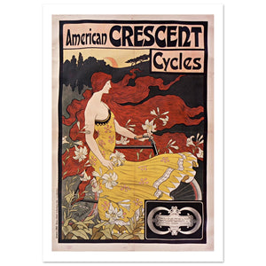 This striking vintage poster for American Crescent Cycles exudes an air of elegance and grace. The central figure, a woman with flowing red hair, wears a vibrant yellow dress adorned with floral details, symbolizing beauty and freedom. She gently holds the handlebars of a Crescent bicycle, her surroundings filled with blooming lilies and a tranquil, sunset-infused landscape. The artistic style draws from the Art Nouveau movement, with bold lines and rich colors that convey a sense of both sophistication and natural harmony. The Crescent logo beneath her adds an elegant touch, emphasizing the high-quality craftsmanship of the bicycle.
