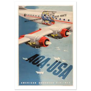 This dynamic vintage travel poster for American Overseas Airlines (AOA) showcases the innovation of the Boeing Stratocruiser. The artwork features a high-angle view of the massive aircraft, highlighting its powerful engines with vibrant red cowlings. A unique cutaway section reveals the "Deux Ponts" (double-deck) interior, where passengers are seen relaxing in spacious cabins. Flying over a stylized blue ocean, the design emphasizes transatlantic connectivity between USA and Europe. With its sleek mid-century illustration style and bold typography, the poster perfectly captures the golden age of luxury and technological advancement in international air travel.