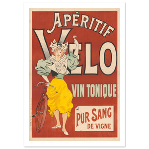 This lively vintage poster promotes Apéritif Vélo, a tonic wine, with a playful and vibrant design. A spirited woman in a yellow skirt, white blouse, and extravagant headpiece, holds a glass of the beverage while standing beside a bicycle, symbolizing energy and joy. The bold red background contrasts with the bright colors of her outfit, making the image stand out. The playful typography, with “Apéritif Vélo” in large letters, reinforces the sense of fun and celebration. The mention of “Vin Tonic” and “Pur Sang de Vigne” suggests the drink’s refreshing, high-quality nature, further elevating its appeal.