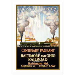 This historic Baltimore and Ohio Railroad Centenary Pageant Vintage Poster celebrates 100 years of the iconic railroad with a beautiful illustration of a steam locomotive in front of a vibrant cityscape. Marking the 1827–1927 centenary, the poster highlights the railroad's rich history and its significant role in American industrial progress. The dramatic smoke from the train adds a dynamic touch to the colorful artwork, making it a perfect piece for collectors of railroad history and vintage travel art.