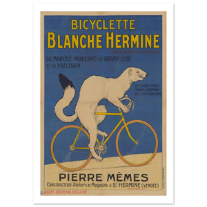 This striking vintage advertisement promotes Bicyclette Blanche Hermine, characterized as a modern brand of "grand luxe" and precision. The central illustration features a large, agile white stoat (hermine) pedaling a yellow bicycle with remarkably pure lines. The text emphasizes that these bicycles utilize high-quality Hutchinson tires. Created by Pierre Mêmes, the manufacturer’s workshops and stores were located in St. Hermine (Vendée). The bold blue background and golden-yellow typography create a sophisticated, high-contrast aesthetic that equates the animal’s natural grace with the bicycle’s technical excellence.
