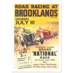 Colorful vintage poster for road racing at Brooklands, showing green and red race cars battling on the banked circuit, promoting the Grand "National" race with prize money and handicap events.