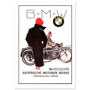 This iconic BMW advertisement from the early 20th century showcases the brand’s signature style and sophistication. The poster features a striking image of a BMW sidecar motorcycle, with the bold black and white lettering of "B + M + W" above. A distinct figure in a red helmet is seen from the back, emphasizing the elegance of the motorcycle and the rider's connection with the machine. The tagline "Die eleganteste und zuverlässigste deutsche Beiwagen-Maschine" (The most elegant and reliable German sidecar machine) highlights the craftsmanship and quality of BMW motorcycles. The clean design and vivid imagery make it a timeless piece.
