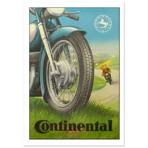 Capture the spirit of classic motorcycle touring with this vintage-style Continental poster. A detailed illustration of a motorcycle wheel with a Continental tire dominates the foreground, while a couple on another bike enjoys a scenic ride on a winding road in the background. The iconic Continental horse logo and brand name are prominently displayed. With its nostalgic, painterly style, this print is a tribute to the freedom of the open road and a perfect collectible for enthusiasts.