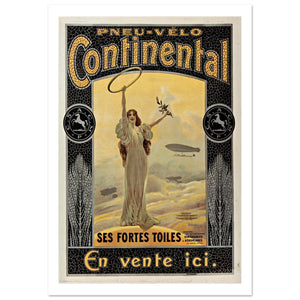 This Continental bicycle tire poster features a stunning and symbolic design, emphasizing the durability and strength of its product. A graceful female figure stands at the center, holding a ring, representing the tire’s resilience, while an olive branch signifies peace and reliability. The background features aerial imagery of zeppelins and planes, reinforcing the sense of quality and innovation. The text "Ses Fortes Toiles" (Its Strong Fabrics) highlights the tire’s strength, and the French tagline "En vente ici" (For Sale Here) invites customers to purchase. The intricate border design and soft color palette add a sense of timeless elegance to the ad.