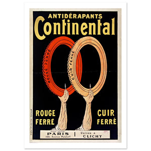 This bold vintage advertisement promotes Continental cycle tires, specifically highlighting their "Antidérapants" (non-slip) qualities. The graphic composition features two muscular arms reaching upward from the bottom of the frame, each holding a distinct tire. One tire is a vibrant red labeled "Rouge Ferré," while the other is a tan color labeled "Cuir Ferré," both indicating reinforced or "ironed" construction for durability. Set against a stark black background with yellow and white typography, the poster lists the company’s headquarters at 146 Avenue Malakoff in Paris and its factories in Clichy.