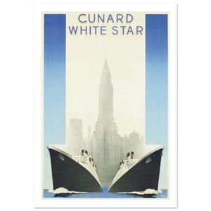 This stunning vintage poster celebrates the grandeur of transatlantic travel with Cunard White Star, the iconic merger of two great shipping companies. The striking composition features two massive ocean liners steaming towards the viewer, perfectly framing the towering silhouette of the New York City skyline, dominated by a magnificent skyscraper (likely the Empire State or Chrysler Building). The cool blue and white palette conveys the immense scale of the sea and the sophistication of the journey, emphasizing the connection between the majestic ships and the modern metropolis. This collectible piece captures the golden age of ocean liner travel and is essential for maritime history enthusiasts and lovers of classic New York City imagery.