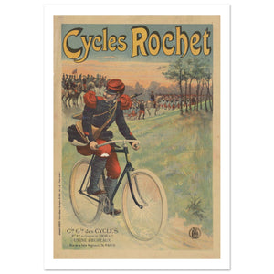 This vintage Cycles Rochet poster features a striking scene of a soldier riding a bicycle, showcasing both the elegance and practicality of the brand. The soldier is dressed in a detailed military uniform with vibrant red epaulettes, highlighting the strength and reliability of the Rochet bicycles. In the background, a group of soldiers marches in formation, emphasizing the connection between military discipline and the precision of the bicycle. The poster’s soft, earthy tones and the Rochet logo at the top draw attention to the brand’s association with quality craftsmanship and robust performance, ideal for both leisure and duty.