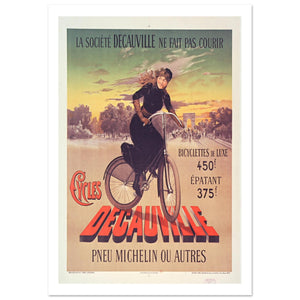 This striking vintage French poster promotes Cycles Decauville with a bold and vibrant design. A fashionable woman in a dark dress rides a bicycle, her hair flowing in the wind, as she glides past the Arc de Triomphe, symbolizing elegance and modernity in Paris. The tagline “La société Decauville ne fait pas courir” (“The Decauville company does not rush”) suggests the leisure and sophistication associated with their bicycles. Promoting both “luxury bicycles” and “Michelin or other tires,” the poster emphasizes high-quality craftsmanship and top-tier performance. The warm sunset colors and dynamic typography add to the poster’s allure, making it a captivating advertisement.