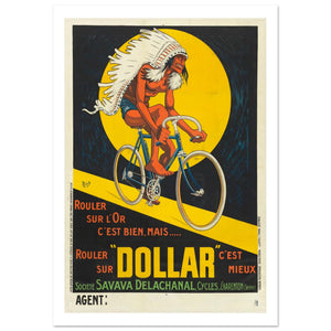 This bold and colorful vintage poster promotes Dollar Cycles, highlighting the message "Rouler sur Dollar c'est mieux" (Riding on a Dollar is better). It features a striking image of a Native American figure, wearing a feathered headdress, riding a bicycle against a glowing yellow moon backdrop. The image emphasizes the cycle's superior quality, symbolizing it as the preferable choice over others, such as gold ("Rouler sur l'Or c'est bien, mais..."). The poster was created by Société Savava Delachanal, based in Haventon (Seine), offering an intriguing mix of striking visuals and clever advertising.