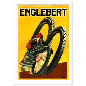 Capture the essence of vintage speed with this striking Englebert Tyres poster. This Art Deco masterpiece features a stylized motorcycle racer leaning into a high-speed turn, framed by the iconic oversized tires that define the brand’s legacy. The vibrant yellow background and bold typography create a dynamic visual impact, making it a perfect statement piece for collectors and enthusiasts. Celebrate the golden age of racing with this classic automotive artwork that brings retro energy to any modern space.