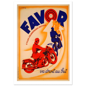 Embrace the spirit of momentum with this vintage Favor poster, a masterpiece of mid-century French graphic design. Created by artist L. Matthey, the artwork features a striking Art Deco aesthetic with three stylized riders in red, blue, and yellow following an upward arrow toward a bullseye. Promoting cycles, velomotors, and motorcycles, the bold slogan "va droit au but" emphasizes efficiency and speed. This vibrant retro advertising print is perfect for collectors of automotive history and classic European industrial art.