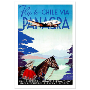 This vibrant Fly to Chile via Panagra Vintage Travel Poster captures the allure of flying to Chile with Pan American-Grace Airways. The poster features a scenic view of the Chilean landscape, with a horse rider in traditional attire gazing toward the majestic Andes mountains as a sleek aircraft soars overhead. The soft colors and striking design highlight the adventure and convenience of air travel to South America, making it an ideal collectible for aviation and travel art enthusiasts.