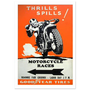 This bold vintage poster, sponsored by Goodyear Tires, promotes the exciting motorcycle races at the Roanoke Fair Grounds on Labor Day. The artwork features a motorcyclist performing a thrilling stunt, riding with one wheel off the ground, epitomizing the action and adrenaline of the race. The orange background with black and white illustration enhances the dynamic feel, while the text "THRILLS SPILLS!" adds to the sense of danger and excitement. The poster directs viewers to the event details, with the date and time, and emphasizes Goodyear Tires' association with high-performance motorsports, making it a striking advertisement for racing enthusiasts.