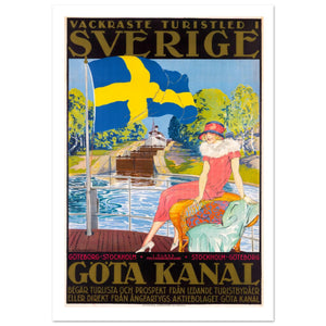 This vibrant Göta Canal Vintage Travel Poster captures the allure of Sweden's iconic waterway. Featuring a fashionable woman sitting on the dock with a Swedish flag waving proudly in the background, the poster highlights the beauty of the scenic Göta Canal route connecting Gothenburg and Stockholm. The bright, colorful artwork and vintage design invite tourists to explore the picturesque landscapes of Sweden. Perfect for collectors, this piece embodies the charm of early 20th-century travel advertisements and showcases Sweden’s natural beauty and cultural heritage.