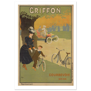 This charming vintage poster for Griffon Cycles captures a leisurely scene of family life and outdoor enjoyment. A stylish woman, dressed in a dark dress and large hat, gestures toward a young boy with a bicycle, while a Griffon bicycle stands nearby. In the background, a couple in a motorized vehicle passes by, blending the worlds of cycling and early automobile technology. The soft autumn colors of the tree-lined path create a warm, inviting atmosphere. The poster conveys the idea that Griffon Cycles offer not just transportation but a refined, leisurely experience in the great outdoors.