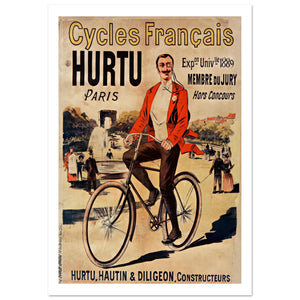 This vintage poster for Cycles Français Hurtu showcases a sophisticated man dressed in a red jacket, confidently riding a high-quality bicycle. His proud stance emphasizes the prestige of Hurtu Cycles, which was awarded "Hors Concours" (out of competition) at the 1889 Universal Exposition in Paris, a testament to its superior craftsmanship. The background features a beautiful Parisian park, symbolizing leisure and high society. The elegant design, bold typography, and historical reference to the "Membre du Jury" (jury member) add an air of distinction to the Hurtu Cycles brand, associating it with quality and innovation.