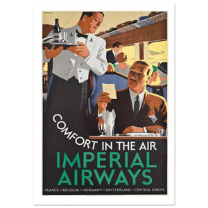 This elegant Imperial Airways "Comfort in the Air" Vintage Poster highlights the luxurious and refined experience of early air travel. Featuring a well-dressed passenger being served by a flight attendant in a stylish cabin, the poster emphasizes the premium service and comfort offered by Imperial Airways. The bold, eye-catching typography and warm color palette, coupled with the airline's route map to key European destinations, make this a timeless piece for collectors and enthusiasts of aviation history and vintage travel design.