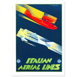 This striking travel poster showcases the Italian Aerial Lines, highlighting the sleek design of two planes in vibrant red and white, soaring through the sky. The dynamic composition of the aircraft, set against a bold blue and yellow background, emphasizes speed and modernity. The poster invites passengers to experience the thrill of air travel with Italy's cutting-edge aerial service, while the distinctive green text further enhances the visual impact.