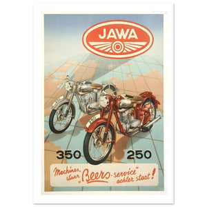 This vintage Jawa motorcycle poster showcases two models, the 350 and 250, set against a soft globe backdrop, emphasizing the international appeal of the brand. The bikes are beautifully detailed, with polished chrome parts, contrasting with the earthy tones of the brown leather seats and handlebars. Above the motorcycles is the prominent red "JAWA" logo, reinforcing the brand’s identity. The text at the bottom, "Machines, waar 'Beers-service' achter staat!" adds a unique touch, suggesting the reliability and service behind the motorcycles. This artistic design highlights the elegance and versatility of Jawa's iconic motorbike models from the past.