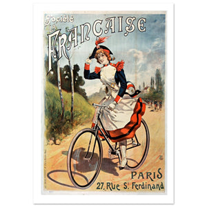 This charming vintage poster advertises La Française Cycles with a bold, energetic design. A young woman, dressed in a military-inspired outfit with red and blue accents, salutes while confidently riding her bicycle along a countryside road. The contrast between her stylish uniform and the leisurely cycling scene highlights the sense of both elegance and speed. Behind her, a group of cyclists follows, emphasizing the social aspect of cycling. The picturesque landscape and the bike’s dynamic positioning suggest freedom and adventure. The poster’s soft, pastel colors and vintage typography invite the viewer to embrace the thrill of cycling, with Paris prominently featured as the brand’s home.