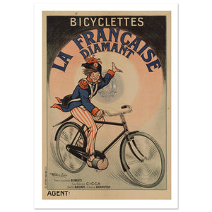 This spirited vintage French poster promotes "La Française Diamant" bicycles, featuring a caricatured rider in a patriotic, revolutionary-style uniform. Wearing a bicorne hat with a tri-color cockade and striped trousers, the cyclist smokes a pipe while pedaling at high speed, creating a blurred effect on the wheels. The design highlights premium components, including Bowden tourist brakes, a C.I.C.C.A. lantern, and a Brown saddle. Created by artist Raoul Vion, the artwork uses a dramatic spotlight effect to emphasize the brand's association with French national identity and technical reliability.