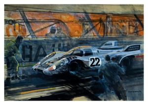 Porsche 917 breaking into the pit stop at Le Mans, 1972. The Porsche 917 emerged in the late 1960s, representing the pinnacle of automotive innovation. Developed by a team of visionary engineers and designers, this masterpiece showcased Porsche's commitment to pushing boundaries. Its evolution from concept to reality involved meticulous engineering, aerodynamic advancements, and relentless pursuit of speed, setting the stage for its domination on race tracks worldwide.