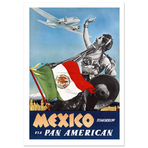 This striking vintage travel poster showcases a woman in traditional Mexican attire holding the Mexican flag, symbolizing the vibrant culture and beauty of the country. Above, a Pan American airplane soars through the sky, symbolizing easy travel to Mexico. The bold title "Mexico Tomorrow" invites adventure, with the poster serving as a promotional piece for Pan American Airlines’ flights to Mexico. The colorful design evokes a sense of excitement and wanderlust for future travelers.