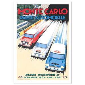 Vibrant vintage-style poster celebrating Mini Cooper’s victories at the Monte Carlo Rally, showing three colorful Minis blasting along the waterfront course, headlights blazing and speed trails streaking behind, with bold typography proudly proclaiming winners 1964, 1965 and 1967 against iconic barriers, tunnel and hillside scenery.