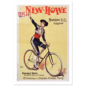 This striking New-Howe Bicycle poster from 1895 highlights both style and performance. A stylish woman in an equestrian-inspired outfit is seen riding the bicycle with grace, holding a flag that reads "1895." The bold red typography announces the New-Howe brand, while emphasizing its prestigious origin in Glasgow. The bike is showcased in motion, with lines suggesting speed and power. The woman's chic pose and dynamic energy reflect the bicycle's innovative design and performance. The poster also features Reginald Smith as the French representative, adding a local touch for Parisian customers, where the bicycles were available.