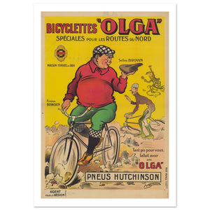 This vintage poster promotes Olga Bicycles, specially designed for the challenging roads of the north. Featuring a jovial, plump man riding the bicycle, the vibrant yellow and red backdrop emphasizes the brand's cheerful spirit. The image portrays a humorous scene, with the man seemingly unconcerned while his companions struggle behind on inferior bicycles. The inclusion of Hutchinson tires, Brown saddles, and Bowden brakes highlights the product’s quality and durability. With the slogan "Tant pis pour vous, fallait avoir une 'Olga'" (Too bad for you, should have had an 'Olga'), the poster humorously emphasizes the superiority of the Olga brand.